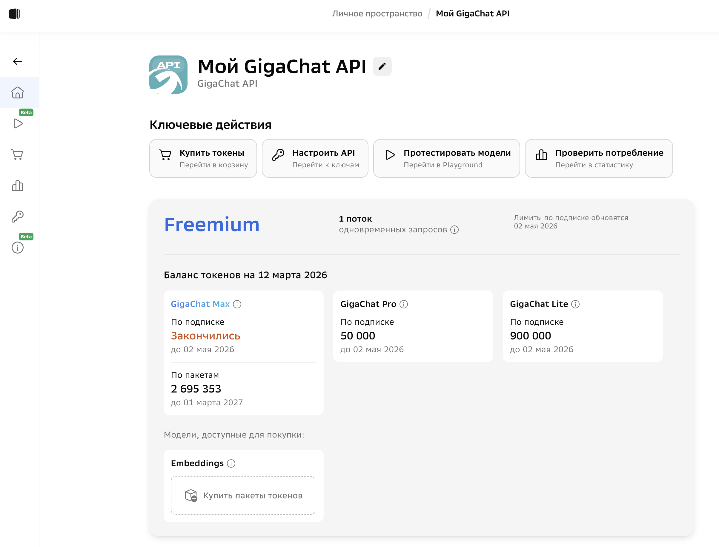 authorization_key— ключ авторизации GigaChat API, это обязательный параметр. Как раз сюда укажете свой API-ключ.oauth_url— URL для получения токена доступа. По умолчанию: https://ngw.devices.sberbank.ru:9443/api/v2/oauth. И в принципе его не нужно менять.scope— область доступа API. По умолчанию этоGIGACHAT_API_PERS, и вам его тоже не стоит менять.