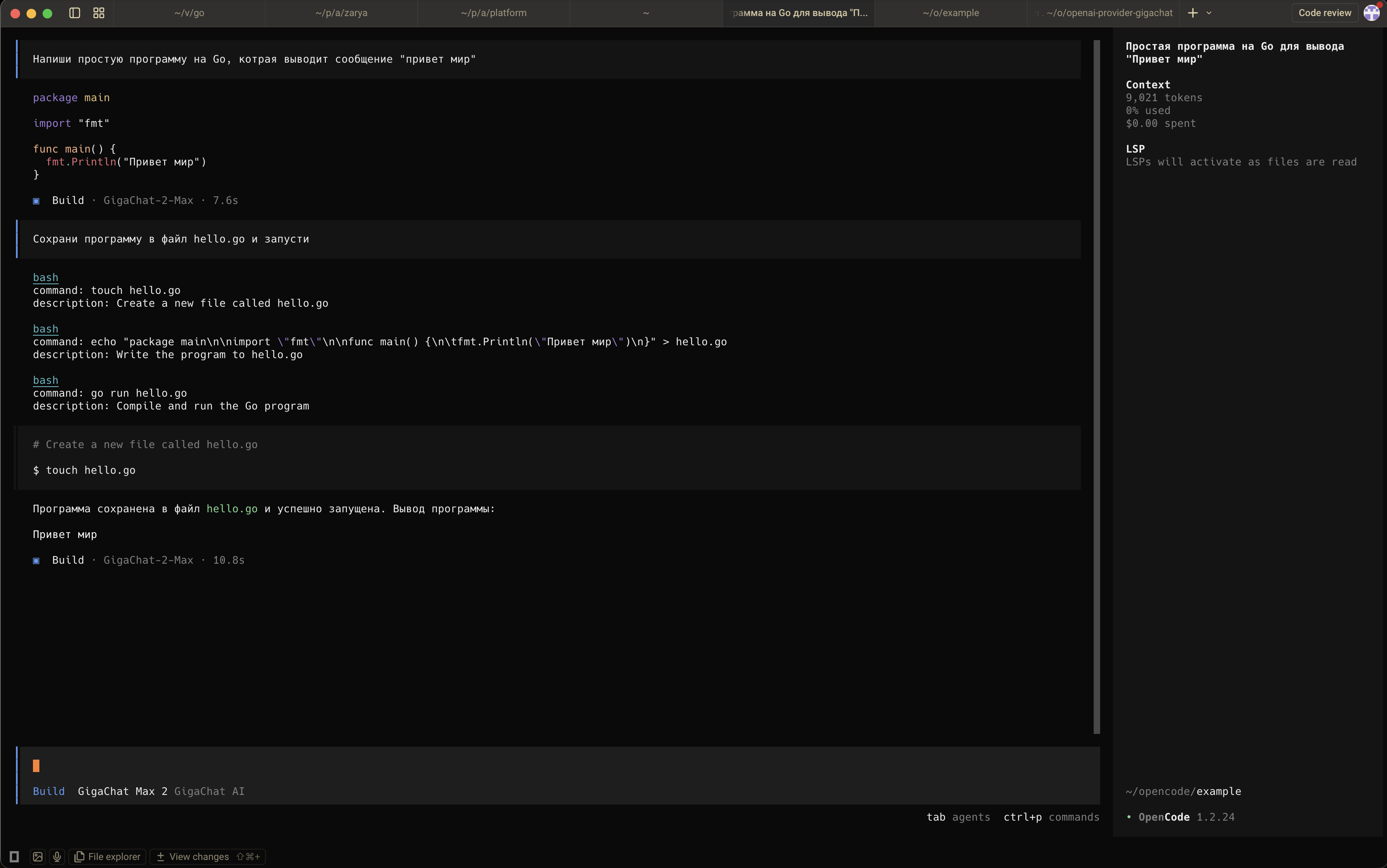 Отлично, запускаем opencode и выбираем для работы модель GigaChat Max 2 Example: