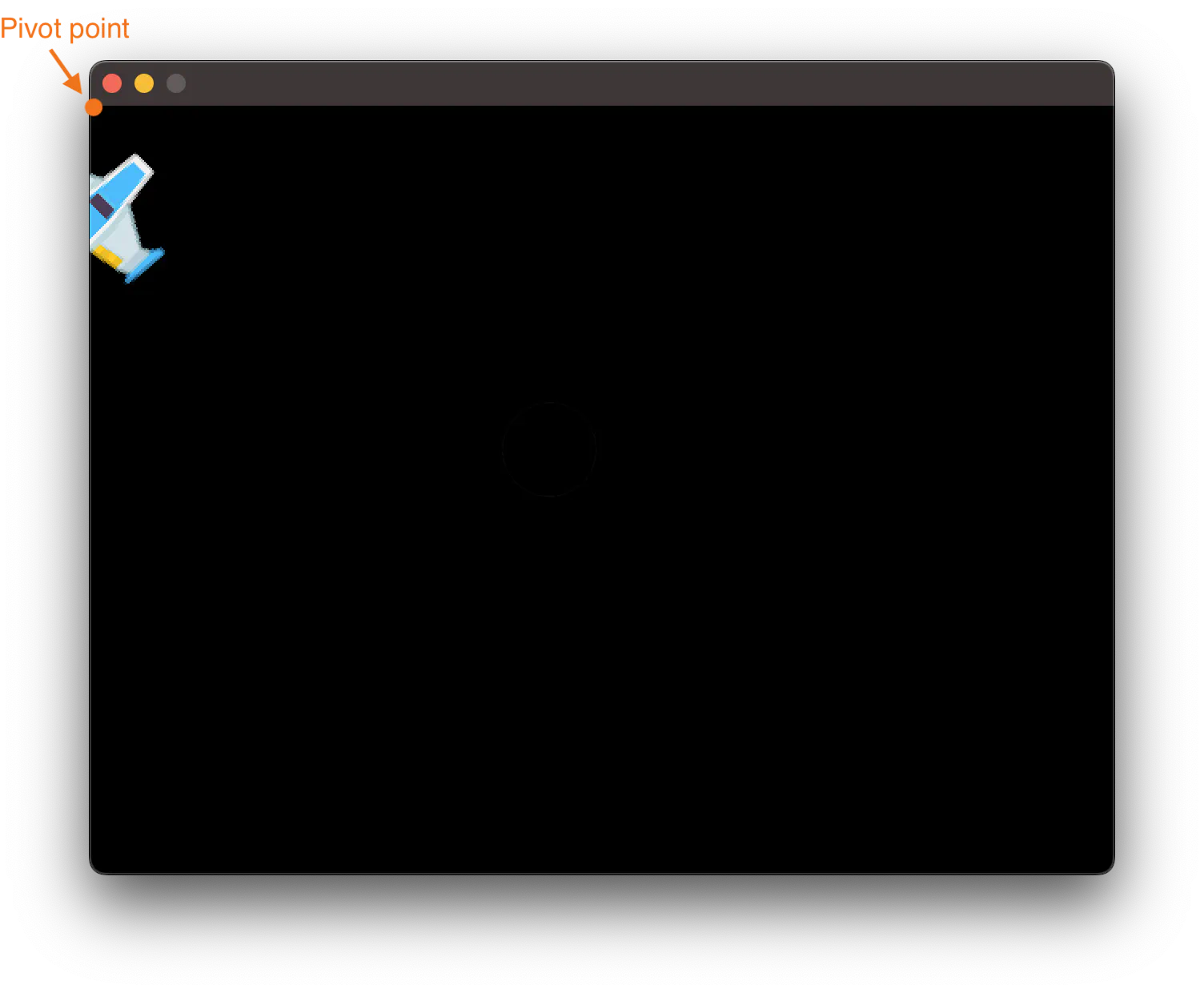 Видите, как изображение частично выходит за пределы экрана? Это происходит потому, что точка поворота (точка, "вокруг" которой вращается изображение) находится в верхнем левом углу изображения. Чуть позже я покажу, как это исправить.